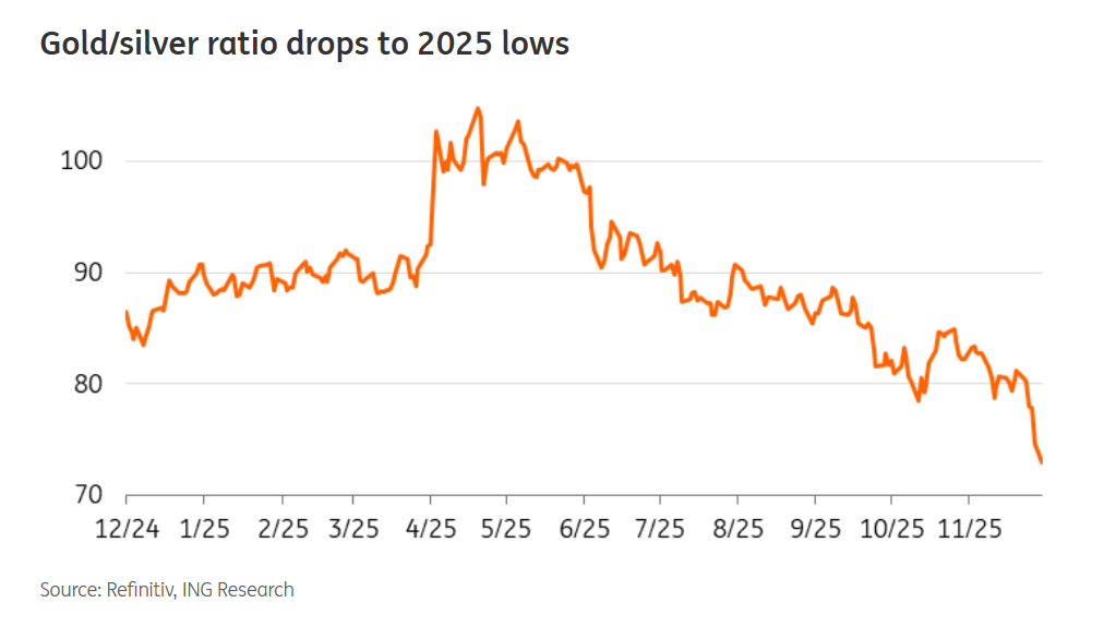 The gold/silver ratio has dropped significantly from its Liberation Day peak of 105, now sitting at a year-to-date low of below 70.
