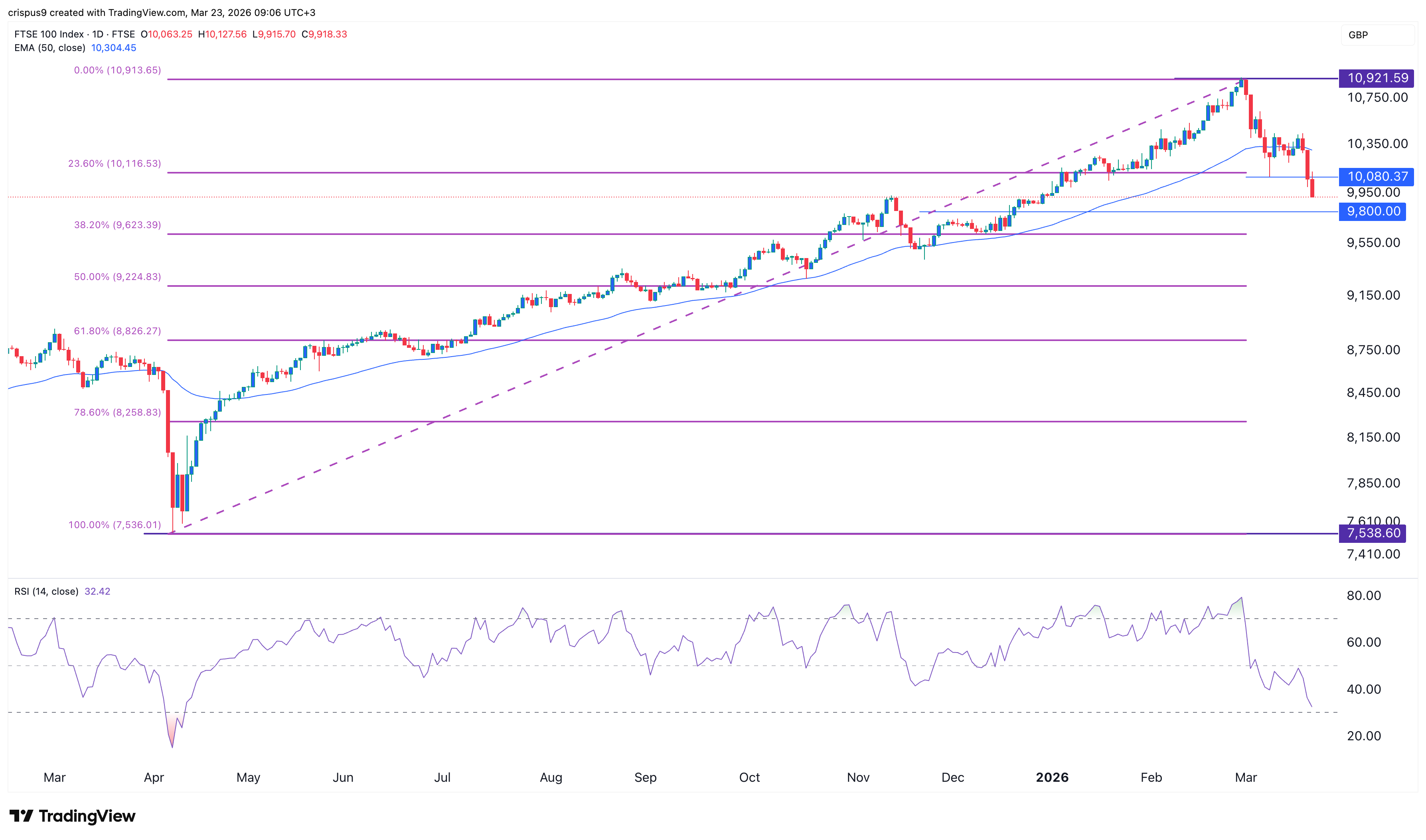 The daily timeframe chart shows that the FTSE 100 Index has slumped in the past few weeks, moving from the year-to-date high of £10,920 last month to the current £9,800.