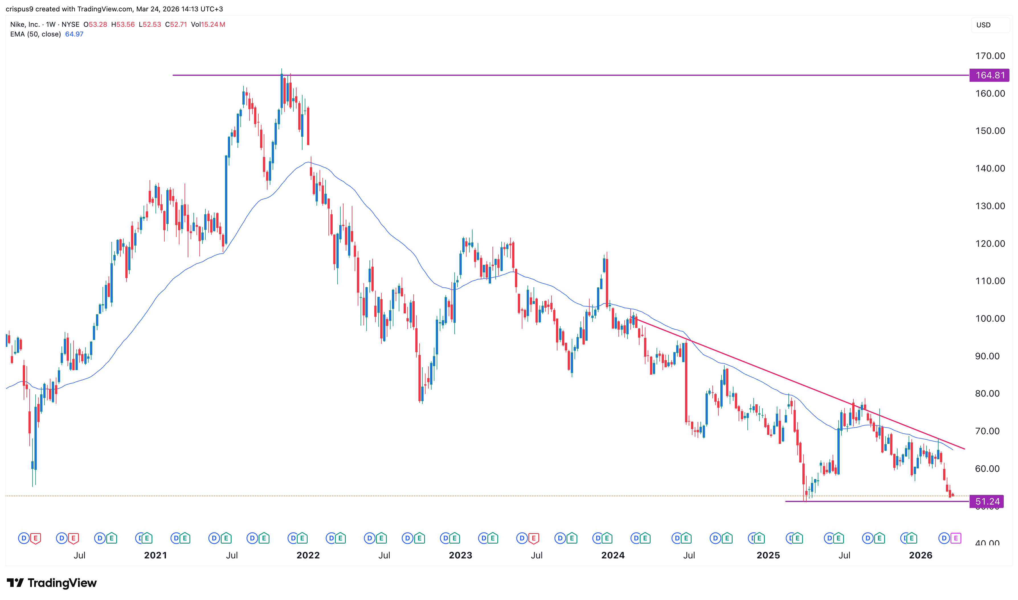The weekly chart shows that the NKE stock price has crashed in the past few years. It has tumbled from a high of $185 in 2021 to the current $52.7.