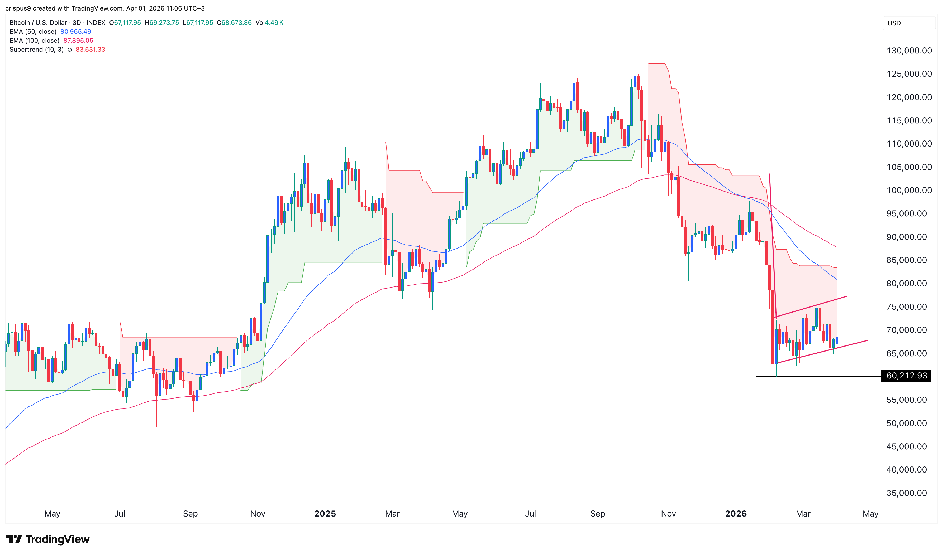 As the chart below shows, Bitcoin has formed the second bearish flag pattern since October last year. This pattern is characterized by a vertical line and some consolidation and often leads to more downside. If this happens, the coin may drop to $50,000 in the near term.