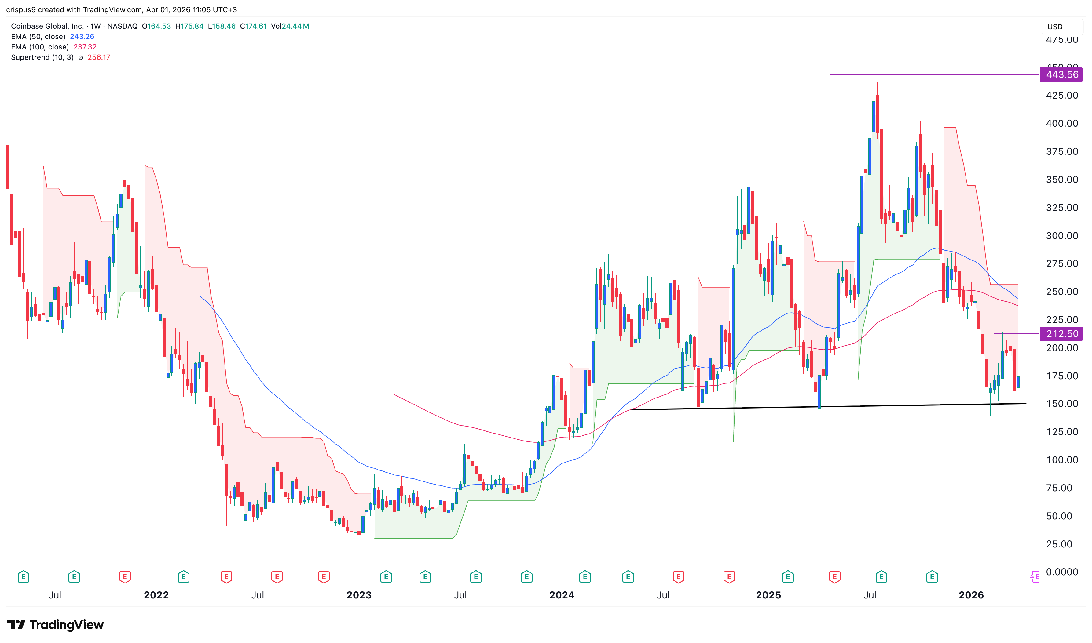 Coinbase stock rose by over 8% on Tuesday as technology companies rebounded amid signs that President Donald Trump was considering ending the war. COIN rose to $177.63, up slightly from this week’s low of $160. Still, technicals suggest that the stock will likely remain under pressure in the near term.