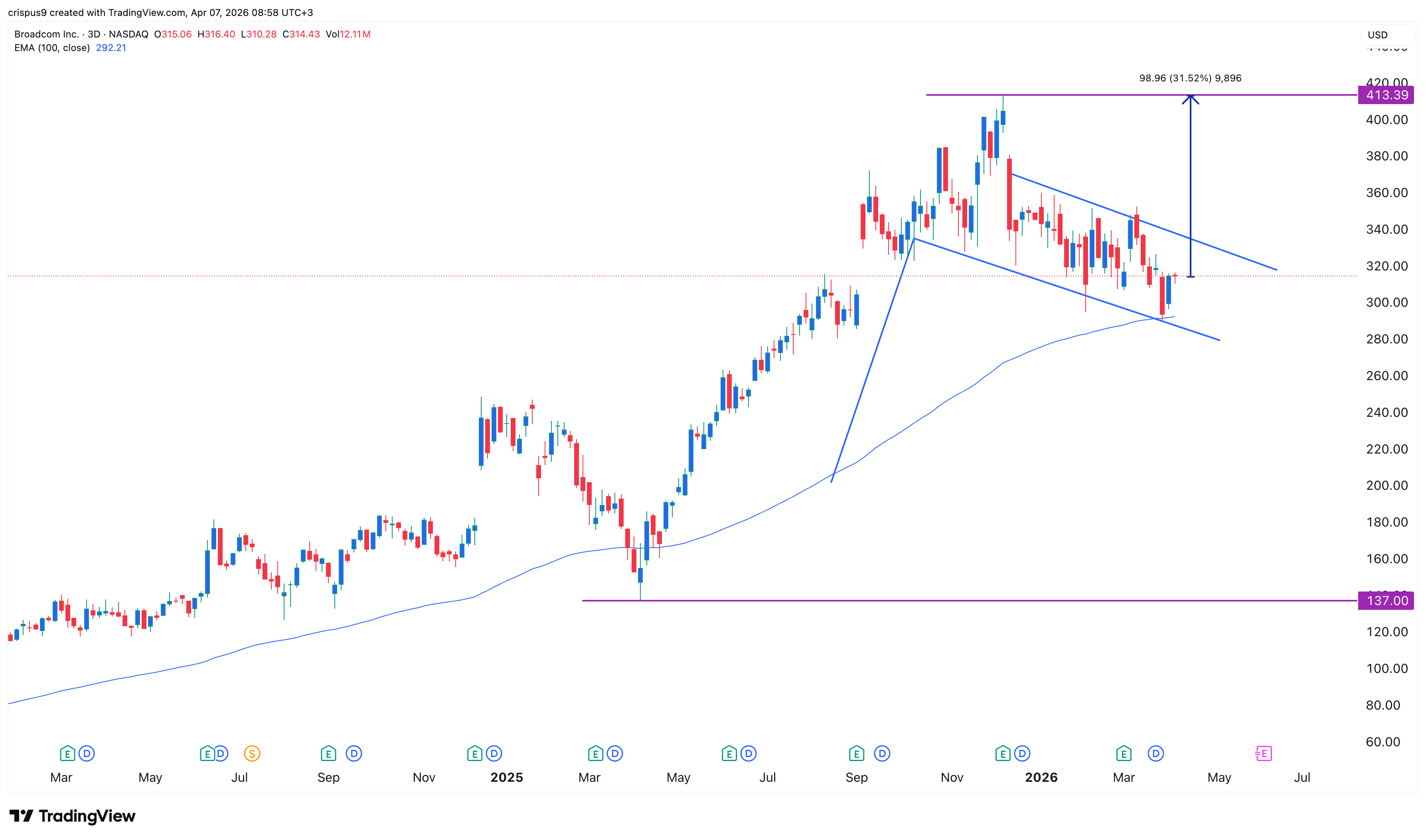The three-day chart shows that the AVGO stock price has dropped sharply in the past few months, moving from a high of $413 in December to the current $315.