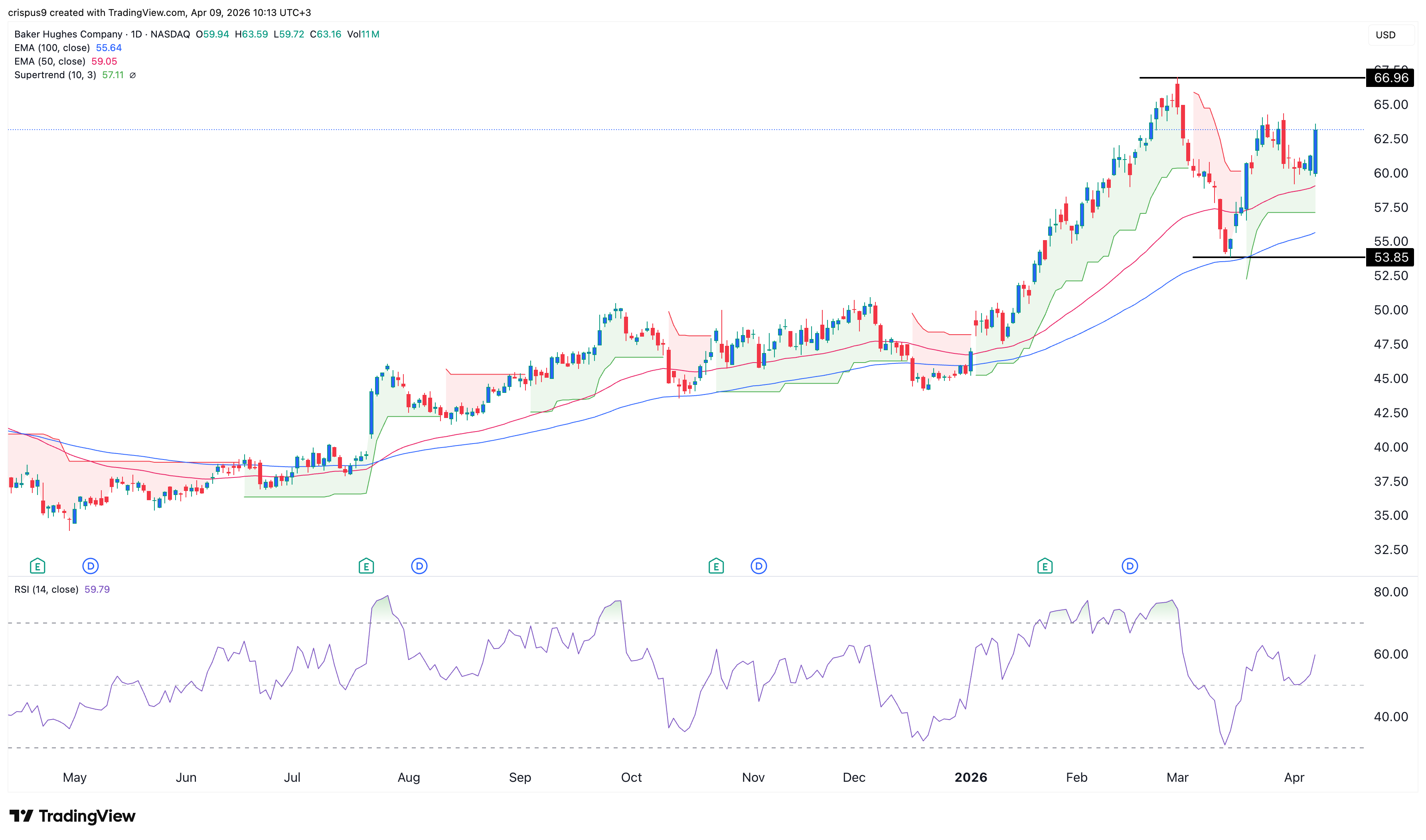 The daily timeframe chart shows that the BKR stock peaked at $66.96 in March this year and then pulled back to $53.85 on March 13 as the Iran war escalated.