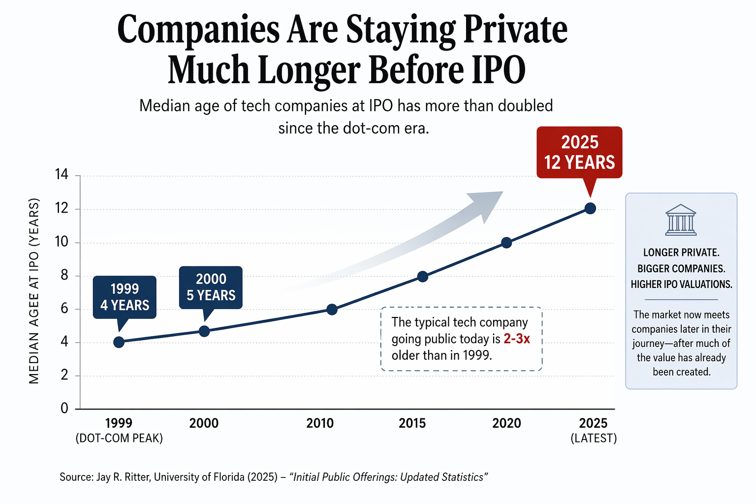 Tech companies going public in 2025 had a median age of 12 years, compared with roughly 4 to 5 years around the dot-com peak.