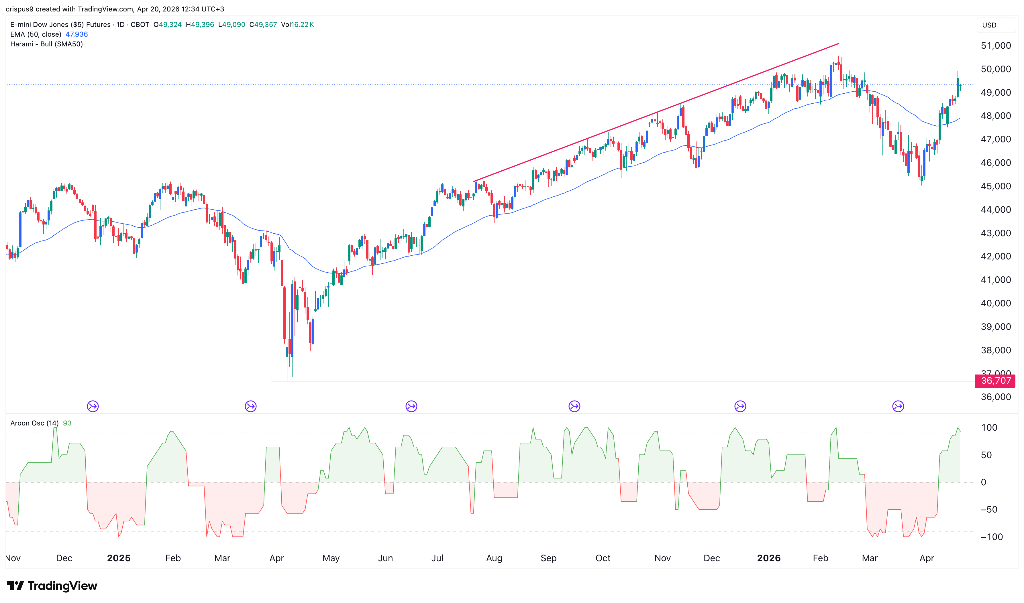 The daily chart shows that the Dow Jones futures have continued rising in the past few weeks, moving from a low of $45,057 in April to a high of $49,883 on Friday. It then pulled back slightly after the weekend developments.